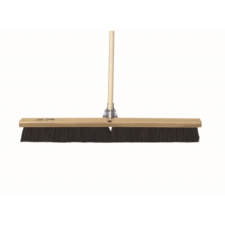 All-purpose floor broom for cleaning concrete and wood floors. Also can be used to brush down new concrete after floating with this wood broom. Popular for finishing sidewalks and driveways or wherever a finish with some traction is desired. The 3" black tampico bristles are secured in a wood block for long use. The 24" wood block provides a sturdy long-wearing base for the bristles. A metal clamp bracket helps hold the handle securely on the broom head. Use with the included 5' broom thread handle or adapter. The quality wooden handle features a metal thread to connect to a variety of tools. The 15/16" diameter metal thread tip won't wear away like a wooden thread. The metal threads create a strong connection providing great leverage on tools.